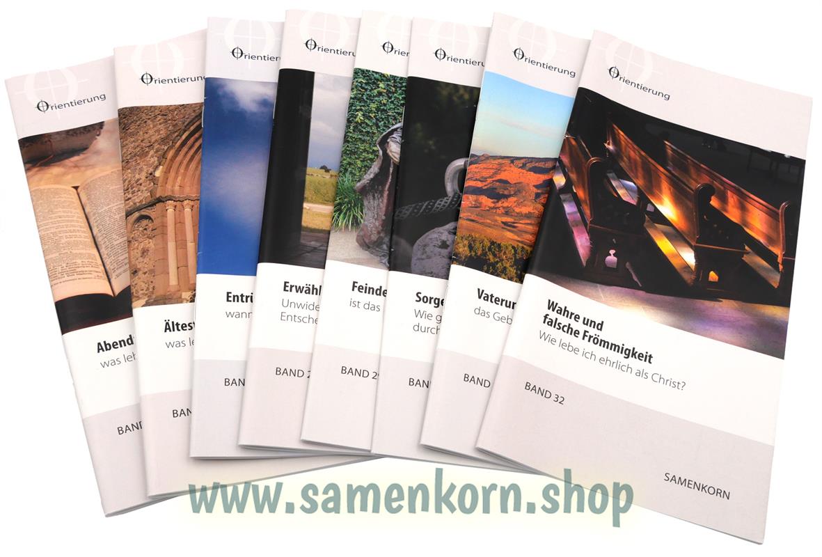Reihe Orientierung, Bände 25-32 Beiträge zu aktuellen Themen im Lichte der Bibel   Band 25: Abendmahl Band 26: Älteste und Diakone Band 27: Entrückung der Gemeinde Band 28: Erwählung und Bekehrung Band 29: Feindesliebe Band 30: Sorgen oder vertrauen Band 31: Vaterunser Band 32: Wahre und falsche Frömmigkeit