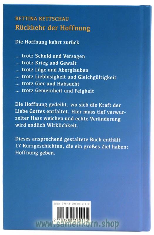 Hoffnung, welch ein schönes Wort. Was verbinden wir damit? Darauf, dass alles gut wird? Oder haben wir die Hoffnung schon längst aufgegeben? Im vorliegenden Buch nimmt uns die Autorin Bettina Kettschau in 17 Kurzgeschichten auf eine Hoffnungsreise mit. Viele Geschichten ereignen sich in den letzten Jahrhunderten und erzählen von verirrten, hoffnungslosen Menschen, die sich bewusst von Gottes Liebe abgewandt haben, um ihr Glück ohne ihn zu finden. Leider hat sich dieser Weg oft als aussichtslos erwiesen. Doch gibt es Hoffnung? Durch wertvolle, gottesfürchtige Menschen, die Gott als sein Werkzeug benutzt, strahlt die Hoffnung zurück in manches Leben und erreicht verhärtete Herzen, für die jahrelang gebetet wurde. Ihnen kommen Bibelverse und Lieder in Erinnerung, die sie nicht mehr loslassen und sie zur Umkehr bewegen. Die einzelnen Geschichten sind spannend erzählt, teilweise mit Liedtexten. Auch Amazing Grace finden wir vor sowie einen Bericht mit der Überschrift "Luthers Lied", was heute noch gesungen wird. Eine doppelseitige Bebilderung mit Überschrift der jeweiligen Geschichte bringt eine angenehme Abwechslung in das Buch. Wer gerne etwas über Hoffnung lesen möchte, die untermalt wird von der Kraft der Liebe Gottes, wird mit diesem Buch viel Freude haben. Selbst für die dunkelste Seele gibt es einen Lichtschein der Hoffnung am Horizont. Ich kann das Buch wärmestens empfehlen. Auch als Geschenk ist es sehr gut geeignet.