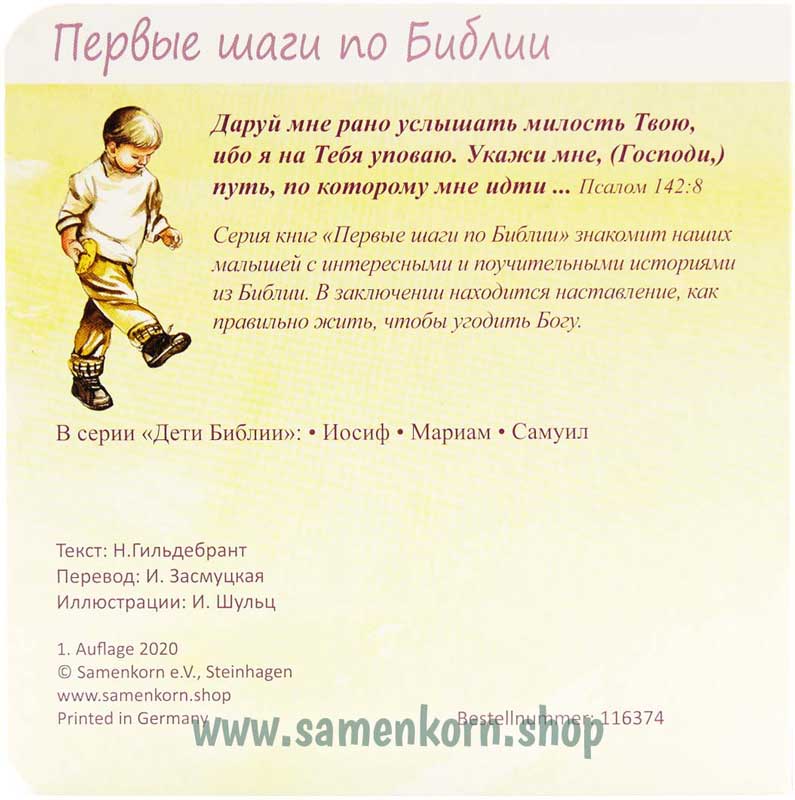 Серия книг "Первые шаги по Библии" знакомит наших малышей с интересными и поучительными историями из Библии. В заключении находится наставление, как правильно жить, чтобы угодить Богу.