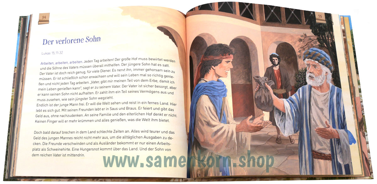 Die Auswahl an Kinderbibeln ist groß, in unserem Schrank befindet sich eine Reihe Bücher mit einzelnen Geschichten und vollständigeren Kinderbibeln. Manche werden von den Kindern regelmäßig und besonders gerne ausgesucht und diese Ausgabe gehört auch dazu. Hier finden Eltern und ihre jungen Zuhörer schöne, natürlich wirkende Bilder und behutsam nacherzählte Erzählungen. In jeder Ausgabe sind zirka 26 Geschichten aus dem Leben Jesu auf jeweils mehreren Seiten erzählt. Am Ende jeder Geschichte finden sich 4 Fragen, die meistens nicht zu leicht, aber auch nicht zu schwer sind und oft nicht nur Gehörtes abfragen, sondern in die Tiefe gehen.