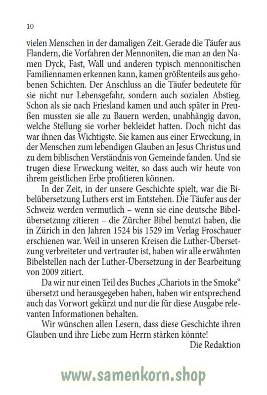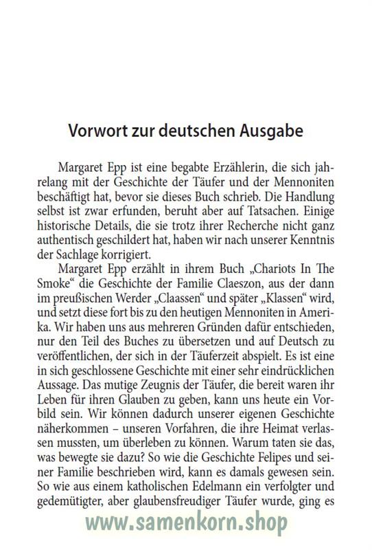 Die spannend und authentisch erzählte Geschichte von Margaret Epp führt den Leser ins 16. Jahrhundert, in die Zeit, in der viele mutigen Zeugen ihren Glauben mit dem Leben bezahlen mussten. Gleichzeitig aber auch eine Zeit, in der viele Wunder passierten und Gott sich auf besondere Weise mächtig erwies. Eine Zeit, von deren Früchten wir heute noch leben.