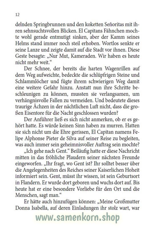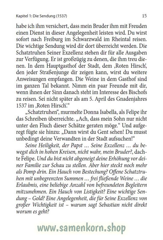 Don Felipe, ein junger spanischer Edelmann, wird von einem Priester mit einer geheimnisvollen Sendung nach Gent geschickt. Der junge Spanier ahnt nicht, was das für eine Sendung ist, und welche weitreichenden Folgen diese Aufgabe für sein Leben haben wird. In Gent begegnet er außerdem seinen Verwandten und einer alten Bekannten seiner Großmutter. Irgendwie sind diese Leute anders, als alle, die er bisher kannte. Sie haben etwas gemeinsam, das dem Spanier mit flämischen Wurzeln fremd ist. Wird er herausfinden können, was es ist? Und warum lässt ihm die ganze Sache keine Ruhe, auch nachdem er seinen Auftrag ausgeführt hat?