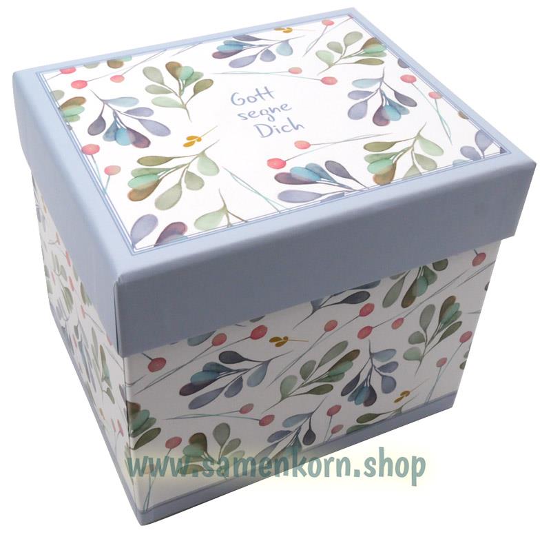 Tasse mit schönem blau-grünen Blättermotiv und Text "Gott segne Dich". Aus Porzellan, Tasse Höhe ca. 10 cm, ca. 0,35 l. Spülmaschinengeeignet, in passender Geschenkbox verpackt. Tipp: Die Geschenkbox eignet sich zum Sammeln von Kleinigkeiten wie Haarspangen, Knöpfen, Stiften, Bastelmaterial usw. und ist ein schöner Blickfang.
