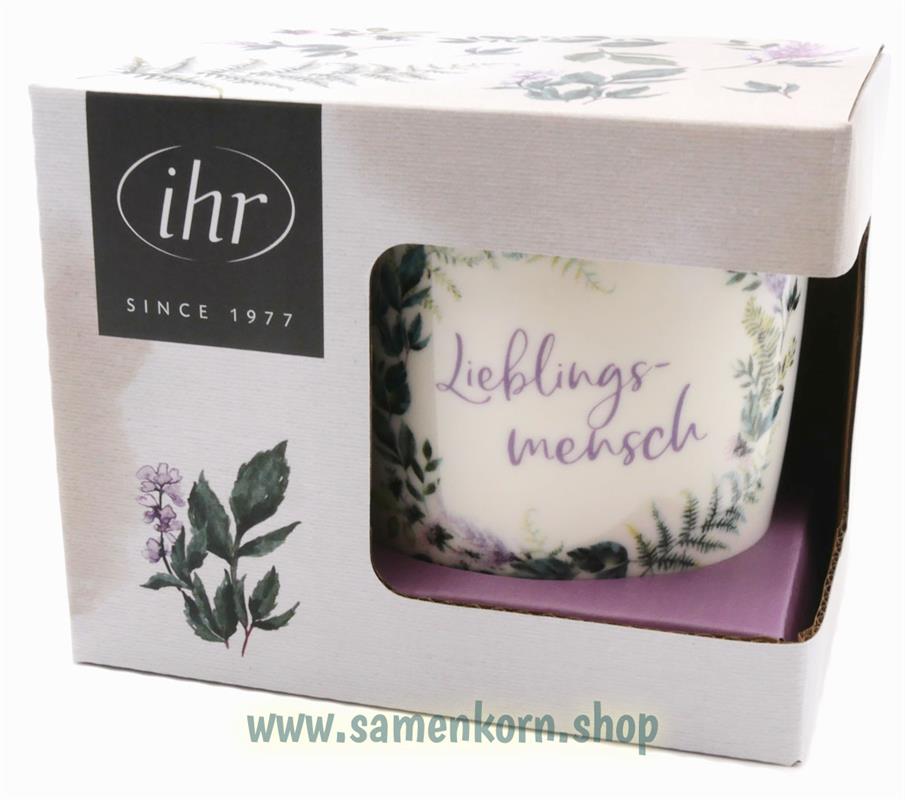 Tasse, mit dem Text „Lieblingsmensch“ im Blumenkranz-Motiv