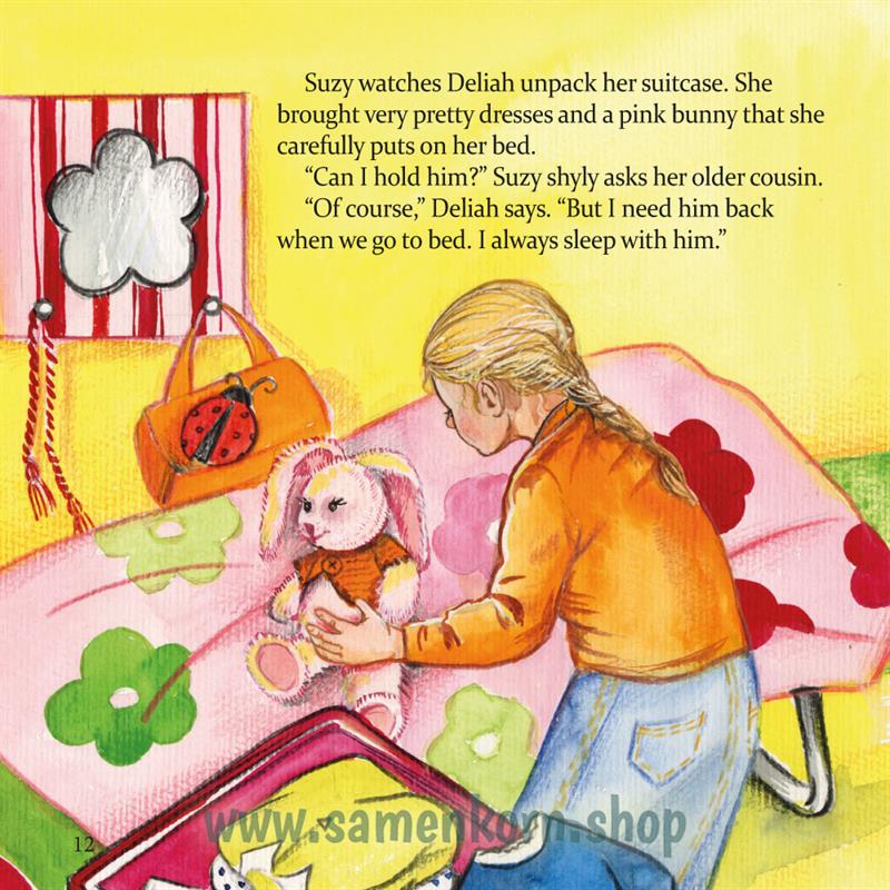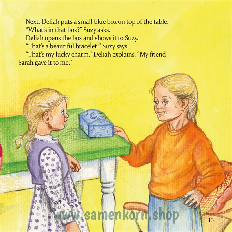 Suzy is excited for the visit of her cousin Deliah. Deliah has a lucky charm to protect her. Grandma Mary explains to the two girls, what the bible says about this, and that God wants to protect them.