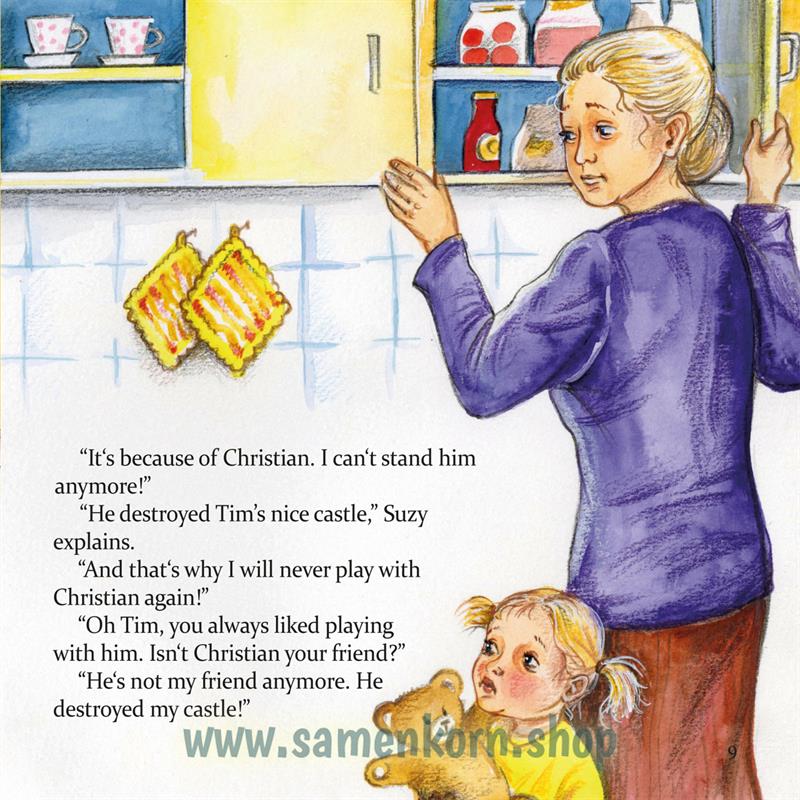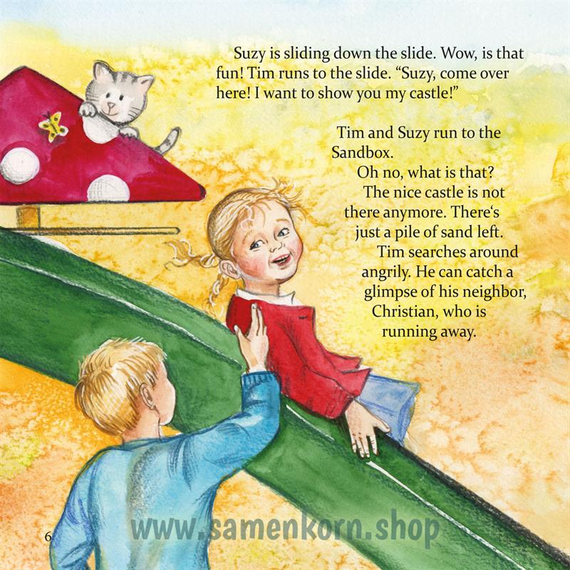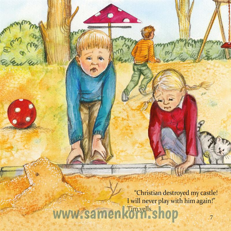 Christian destroyed Tim's sandcastle. Tim is very angry and never wants to play with Christian again. Mom tells Tim a biblical story about forgiveness. But will he be able to forgive his friend?