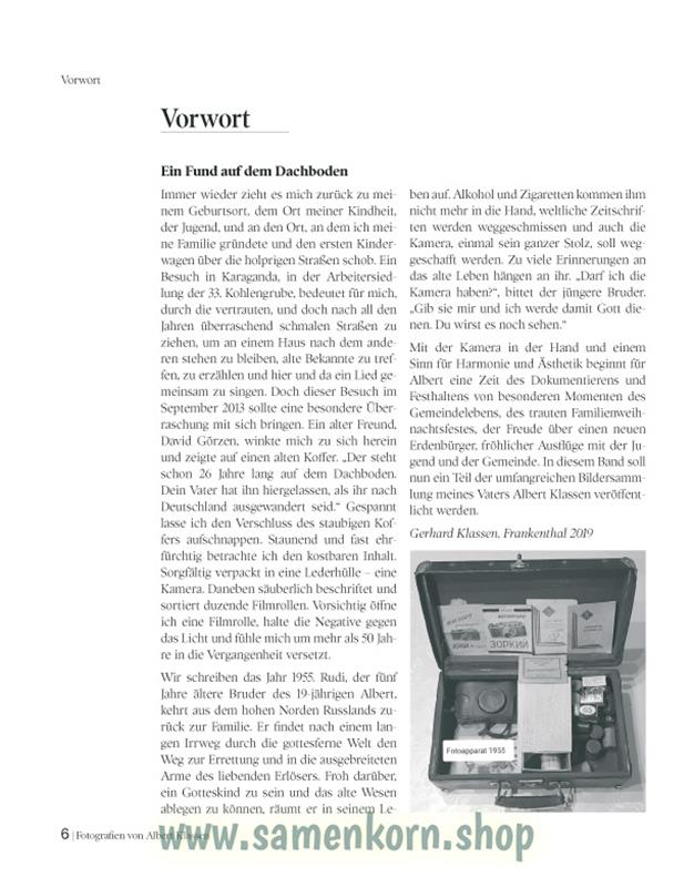 Auf den Fotos (1957–1983) ist das damalige Gemeindeleben abgebildet, sowie Hochzeiten, Beerdigungen und verschiedene Familienanlässe in Sibirien und Kasachstan. Außer dem Fotomotiv hat Albert Klassen oft Details festgehalten, die die Bilder zum Leben erwecken.