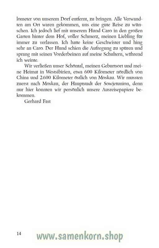 Der zehnjährige Gerhard Fast weiß nicht, dass der Weg seines Lebens, gestartet in Sibirien, über Moskau ins Kirov-Gebiet, dann wieder über Moskau nach Deutschland, durch die Gefahren nach dem zweiten Weltkrieg schließlich zum Zielland Kanada führen wird. Was sich alles auf diesem Weg zugetragen hat, teilt der Autor seinem Buch mit.