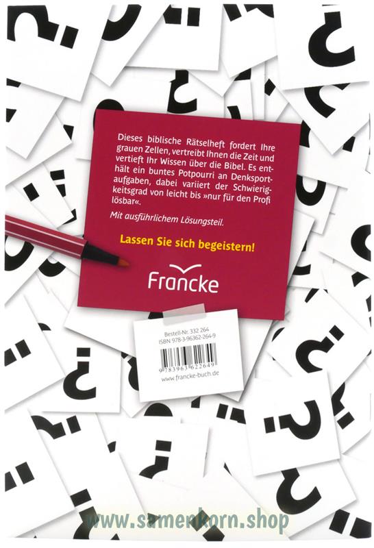 Biblische Rätsel und Denksportaufgaben fordern unsere grauen Zellen, unterhalten uns, vertreiben uns die Zeit, erweitern unseren Horizont und vertiefen unser Wissen über die Bibel. Dieses Rätselheft enthält ein buntes Potpourri ganz unterschiedlicher Rätsel, von herkömmlichen Kreuzworträtseln über Multiple-Choice-Fragen bis hin zu Steckbriefaufgaben. Dabei variiert der Schwierigkeitsgrad von leicht bis »nur für den Profi lösbar«. Mit ausführlichem Lösungsteil.